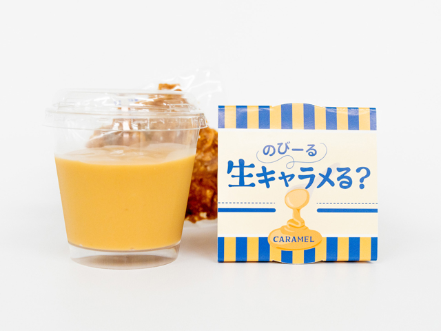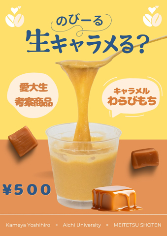 プロジェクトにご協力いただいた他4名の学生と共に、商品開発が始動してから計8回、亀屋芳広本店に足を運び、若年層が手に取りやすい工夫やSNS上で話題となる条件などを整理しながら議論を重ねました。その中で、亀屋芳広のわらび餅とキャラメルを掛け合わせることで、若者に受け入れられる新感覚の和菓子が生まれるのではないかと方向性が固まったのです。スプーンで混ぜると伸びる特徴を生かし、コト消費を前提とした楽しむアクションを採り入れることで、SNS映えもできるのではないかと試作品を作ること5回。10種類を1度に試食したこともありました。そして完成したのが「のびーる生キャラメる?」だったのです。名鉄商店で販売したのですが、本商品は短期間で大きな反響を集め、想定以上の販売実績を達成することができました。