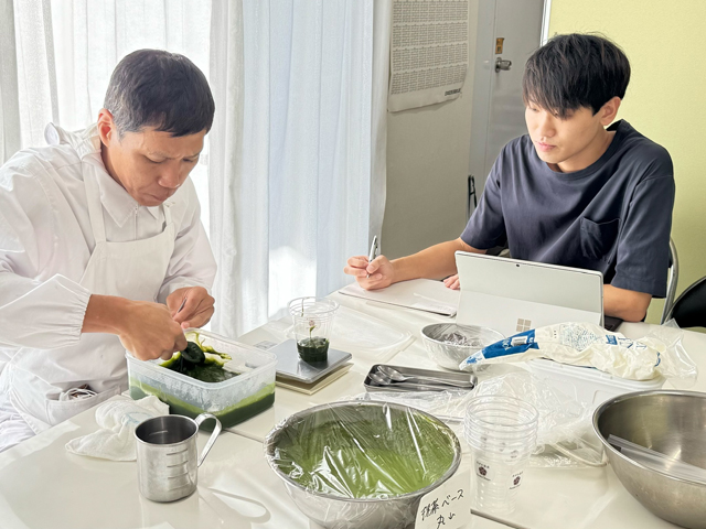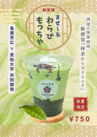 また昨年(2025年)9月には、愛知大学名古屋キャンパスにおける未活用地帯を活用し、若者に日本の伝統文化を伝えることを目的とした「“和”の未来創造プロジェクト」を新たに企画しました。そして、私がリーダーとして学生7名の開発チームを率いて、亀屋芳広と再び新たな和菓子を開発することになりました。今回のプロジェクトでは、商品を通して日本文化を伝えることを目的としたため、近年海外で大流行している抹茶を使用した商品を提案しました。2か月あまりという短い期間でしたが、抹茶味のわらび餅ドリンク「まぜーるわらびもっちゃ」を開発することができました。この商品は、抹茶味のわらび餅の上にアイスクリーム、抹茶ムースを入れ、ホイップクリームやあずき、花あられをトッピングしたものです。これにお点前を連想させた、かき混ぜるというアクションを加えて飲む仕様にしました。和の文化を体現する商品として完成し、クライアント企業である亀屋芳広様にも喜んでいただきました。11月に開催された愛知大学名古屋キャンパスの大学祭「ささしま祭」にてこのドリンクを300個、以前開発した「のびーる生キャラメる?」を250個販売し、大変多くのお客様に商品を届けることができました。 また本プロジェクトは、公益財団法人 愛知大学教育研究支援財団 奨励賞において功労賞を受賞しました。自分のビジョンに基づいて企画したプロジェクトをご評価いただき大変嬉しく思います。